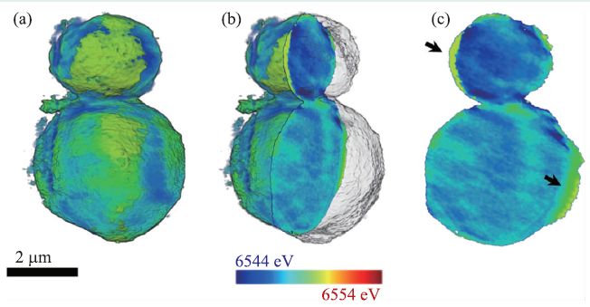除了对不同元素的敏感性以外,同步辐射谱学成像技术还可以识别材料的氧化态,并且在三维空间中对不同价态组分进行精确定位。这个方法被广泛应用于储能材料的研究,并且取得了巨大成功。下面举两个具体的例子来讨论三维化学价态分布与能源材料性能之间的关系。