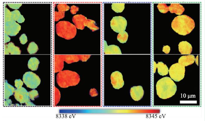 图8 锰钴镍三元电极材料中镍元素氧化态的二维分布图。这些颗粒处于不同的整体充放电状态,并且显示出颗粒内部的局域充放电程度不均性(引自参考文献[30])