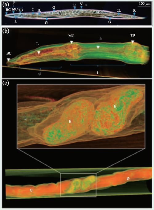 图12 为秀丽隐杆线虫的纳米相衬成像结果。其中,图12(a)以解剖学形式显示了线虫的相衬成像结果,可以明显地看到咽部(P)、上消化道颊腔(BC)等结构;图12(b)基于三维相衬成像结果给出了线虫咽部和上消化道的解剖学形式表面展示图,可以看到颊腔(BC)、管腔(L)等结构细节;图12(c)显示了线虫身体中间部位的显微结构,可以看到管腔(L)、性腺(G)和子宫中的受精胚胎(E)等结构。