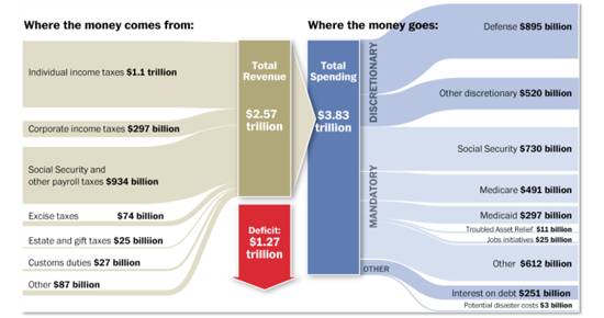如下图,在美国联邦预算剖面图里,用不同高度的货币流清晰的表达了资金的来源去向,及每一项所占金额的比重。