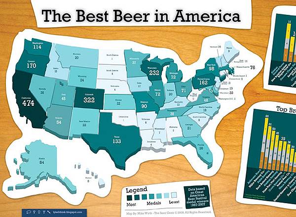 下图中,通过以美国地图为大背景,清晰的记录了不同州所产啤酒在1987-2007年间在美国啤酒节中获得的奖牌累计总数。再辅以颜色可视化的方法,让用户清晰的看到美国哪些州更盛产好喝的啤酒。
