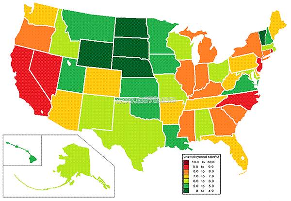 在图中可以看到,通过对美国地图以州为单位的划分,用不同的颜色来代表不同的失业率等级范围,整个的全美失业率状况便尽收眼底了