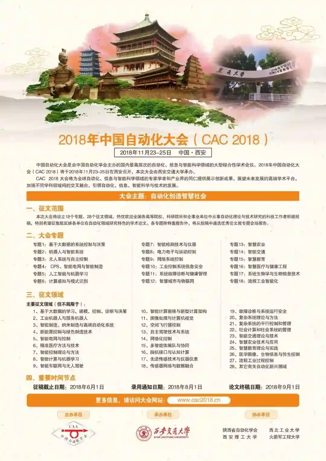 中国自动化大会是由中国自动化学会主办的国内最高层次的自动化、信息与智能科学领域的大型综合性学术会议,2018年中国自动化大会(CAC2018)的主题为“自动化创造智慧社会”,大会将于2018年11月23-25日在西安召开。本次大会由西安交通大学承办。