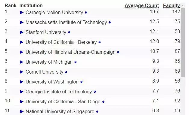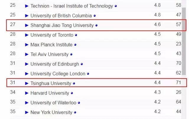 排名前三都是美国高校:卡内基梅隆大学、麻省理工学院、斯坦福大学。国内高校的话,上海交通大学以4.6的得分位列第 27 名,清华大学与爱丁堡大学、UCL 并列全球第 31 名