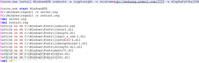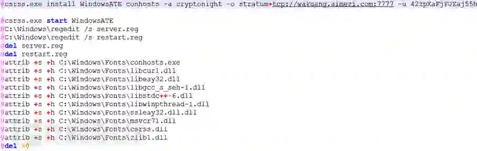 | 挖矿程序: | C:\Windows\Fonts\conhosts.exe | 负责挖矿获取门罗币 |