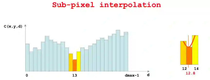 最后再简单介绍一下视差细化。通常情况下,我们在经过上面介绍的3步(匹配代价计算→代价聚合→视差计算)后得到的视差是像素级的精度,但是有些应用我们希望能达到亚像素级精度 [8][9],这样我们就需要对得到的视差做细化(refinement),最常见的细化操作就是二次插值。
