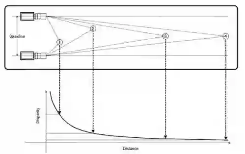 这就是基本的双目三角法原理,从上面的公式可知,视差(disparity)与距离(distance)Z成反比,如下图所示:
