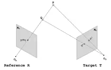 回顾以上,我们得到结论:理想的正面平行双目系统,需要通过相机标定得到相机内外参才能计算深度。但是现实世界中的双目摄像头无法达到理想环境,所以需要采用某种算法,对实际的双目成像系统进行补偿、矫正,譬如将采集到的左右图变形(warp),使之行对齐。为了实现这一点,需要引入极几何(epipolar geometry)的概念。