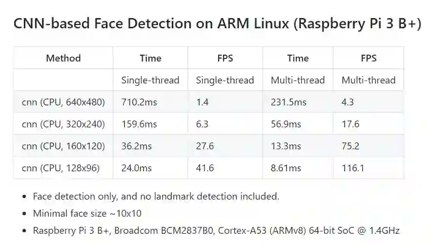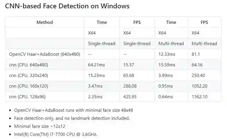 速度快:在树莓派上可以实时进行人脸检测;有采用AVX2(x64平台)和NEON(ARM平台)指令集进行优化。
