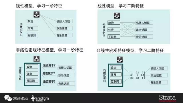 那么,如果我们要学习二阶特征呢?对于线性模型(如右上角所示),我们也需要用到用户的历史兴趣点,将用户的历史喜好与文章的话题进行组合(User_Topic-New_Topic),这样模型就可以学到历史上喜欢什么样话题的人还会喜欢什么样的新闻话题,达到二阶迁移的目标。对于非线性模型(如右下角所示),我们要做的将原先的一阶逻辑判断(可以认为是个Identity矩阵)变成一个二阶状态转移矩阵,通过历史统计得知不同话题间喜欢转换的情况,推算出一个不在用户现有兴趣点中的文章话题是不是用户喜欢的。