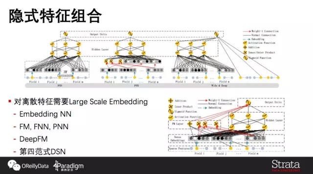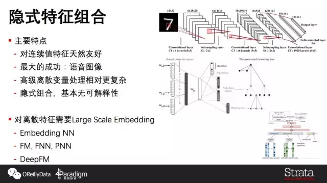 隐式特征组合主要特点是对连续值特征非常友好,最成功的应用场景是语音和图像。在这些原始信号是像素或是声波的问题里面,深度学习通过神经元网络产生底层的Filter以及层次化的特征组合,获得了远超人类手工特征工程的效果。但是深度神经网络并不是万能的,在深度学习中,高维离散特征的变量处理非常复杂,同时缺乏可解释性,过于黑盒化也是神经网络大家关注的焦点。这样会导致深度学习出来的特征组合相对难用到其他算法之上,也很难给人明确的信息反馈。