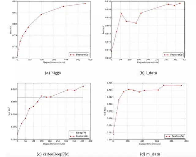 我们也实验了效果随着时间与新组合特征的加入而发生的变化,如下图所示。可以看到随着时间的变长,特征组合数越多,特征组合效果会越来越好。