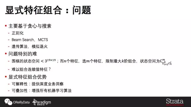 虽然有着重重困难,显式特征组合的优势在于可解释性,会提供一个非常深入的洞察,可以知道哪些特征是潜在有关系的,应该组合起来;同时这样的方法享受比较好的可叠加性:所有机器学习算法都基于特征,显式特征组合的产出是特征集,这个特征集可以增强所有其他机器学习的算法,成为训练的基础。