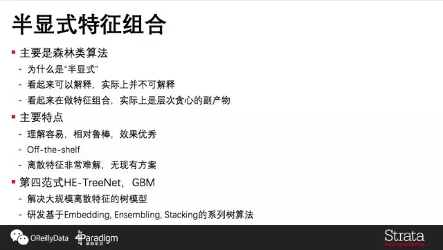 第二个是半显式的组合,主要基于的是树模型。为什么说是“半显式”呢?因为大家可能认为树模可解释或者做特征组合是很自然的事情,但其实并不是:叶子节点的每一个分支并不是一种显式、直接的特征组合,而是这些特征在特定取值区间的组合。所以从结果上来说我们做到了特征组合,有一定可解释性,但是同样也没有办法直接看特征相关性或者特征之间组合关系。作为非线性模型,树模型主要的特点是容易理解,效果也是非常好的。但是类似的,它对离散的精细特征非常难处理,传统上训练一棵m个特征n个训练数据k层深t棵树的模型需要O(mntk)的时间,即使对系数特征进行优化,也很难降低特征分裂中分桶上的空间与传输消耗。在这个方面,第四范式提出了一系列算法,包括HE-TreeNet和GBM系列算法,通过Embedding,Ensemble、Stacking,General Boosting等方式让树模型可以在大规模特征的情况下可以进行特征组合。