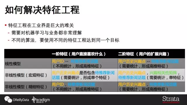 沿着特征走主要是由工业界来主导,比如说谷歌的Adwords里面有上千亿的特征,想要描述为什么会产生一次广告点击,这就需要解决高效并行的问题。这些技术大部分进展来自于KDD或是WWW。沿着特征优化机器学习,就是把问题通过特征的方式分的足够细,做非常准确的模型。