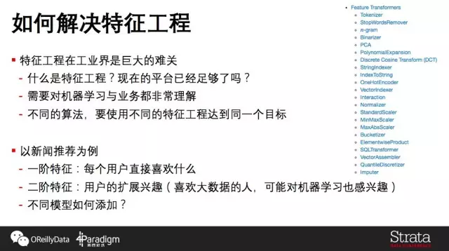 如何降低这些门槛呢?这里分享一下第四范式的成果。首先特征工程是工业界应用AI的巨大的难关。特征工程的目标是针对于某个模型找出与要解决问题相关的关键属性,现在也有一些开源的项目尝试解决特征工程,下图就列出了Spark 2.2官方文档中包含的特征工程算法。那么,针对不同的业务、不同的模型,这些算子就足够我们低门槛建模了吗?