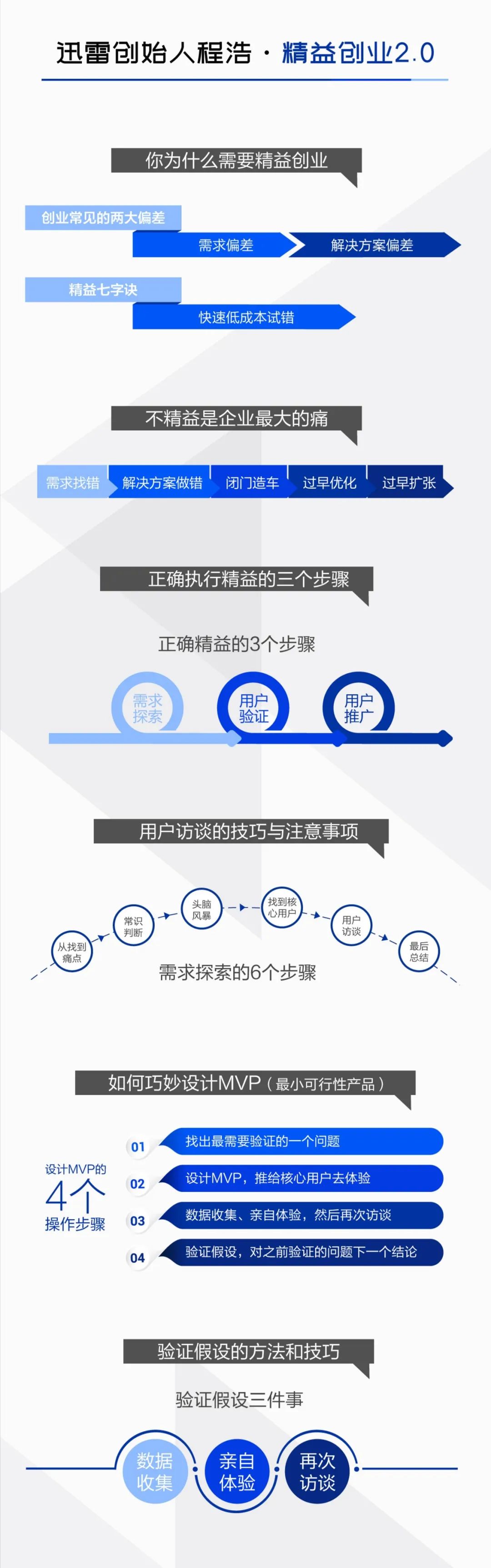 结合迅雷并不平坦的创业经历,以及十多年企业一线管理的实战经验,程浩对埃里克·莱斯的《精益创业》做了深入的研究,也在自身实战基础上做了全新和丰富的解读,甚至在转型投资人后,多次作为创业营的导师,给国内的创业者们讲过精益创业的课程。