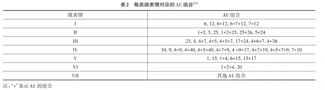 表1列出了每类整体表情中可能出现的AU[16],这些AU同时出现或部分同时出现于整体表情,例如快乐表情可以由AU 6,AU 12和AU 25的组合来表示,悲伤表情可以由AU 1,AU 4,AU 6和AU 17的组合来表示.值得注意的是,人们在意识到自身表露出一种可能不合适的表情时经常会试图抑制它来隐藏真实的情绪,而只要试图掩盖原来的表情其面部便会自发地出现微表情(Micro-Expression)[19].微表情的持续时间很短,一般的界定标准为持续时间不超过500 ms[20],这是其区别于宏表情(Macro-Expression)的主要特征[21].微表情也可以用AU的组合进行描述,表2具体定义了每类微表情对应的AU组合[22],其中I,II,III,IV,V和VI类分别与快乐、惊讶、愤怒、厌恶、悲伤和恐惧相关,VII类与蔑视等其他微表情相关.例如,微表情I类可以由AU 6,AU 7和AU 12的组合或单个AU 6来表示.因此,研究AU识别对微表情识别同样具有重要意义.