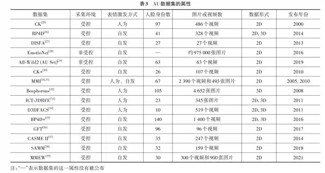 本文接下来对一些流行的AU数据集进行介绍,由于数据集的采集环境(受控、非受控)、表情激发方式(人为、自发)、样本多样性(人脸身份数、图片或视频数)、数据形式(