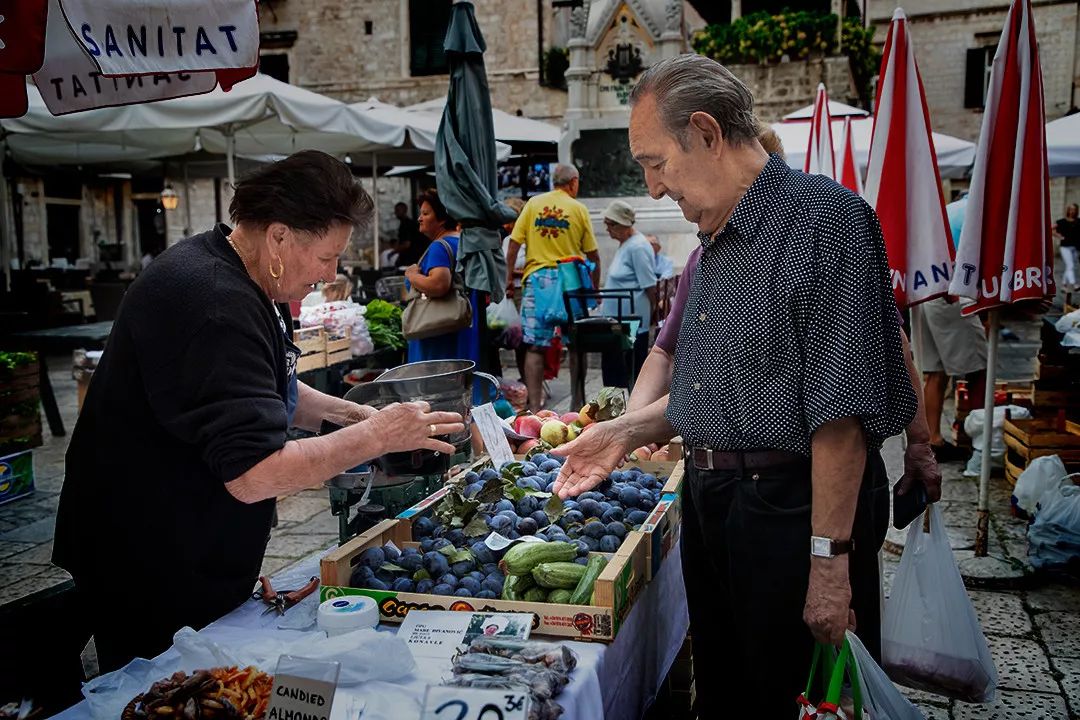 小广场上有个集市,当地人在售卖各种土产。无花果干是地中海特产,一粒粒饱满润泽,咬一口,柔韧的果肉中藏着无数个甜蜜的“爆珠”。古老的雕塑静静地俯瞰着热闹的集市,历史与现世就在这里无缝衔接。