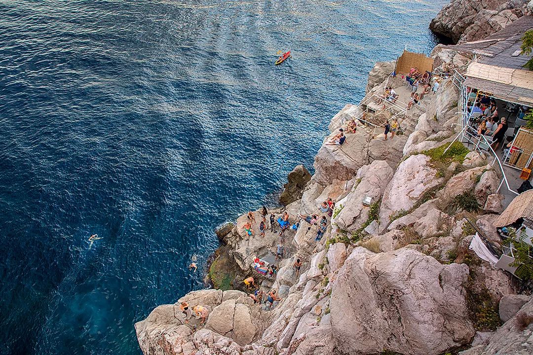 古城南侧海边有个悬崖咖啡店,一群来自美国的年轻男女在悬崖跳水。钴蓝色的海水中白帆点点,港口渡轮往来密集,但海水仍清澈见底。