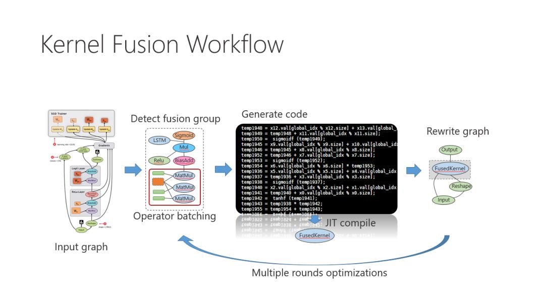 解决这一问题的主要思路是内核融合(Kernel Fusion)。一些手工的优化方法就运用了这一思想,比如NVIDIA基于CuDNN的RNN库函数。它把整个循环神经网络实现成一个GPU的内核函数,因此获得了非常好的性能。然而它的缺点也非常明显,那就是不够灵活和通用,无法应用在其它网络或一些变种的循环神经网络中。而我们更加关注的是如何在深度学习的系统中自动地对任意的网络模型实施优化。