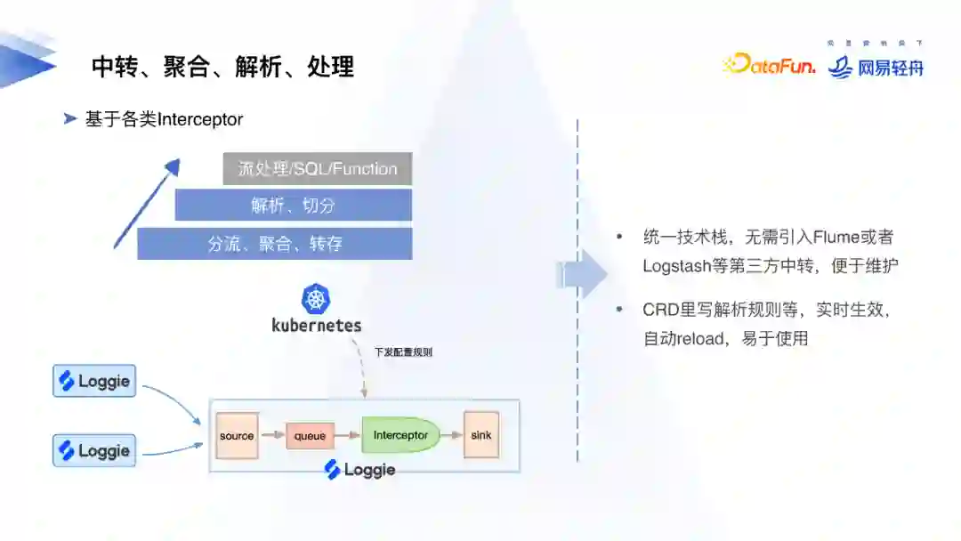 Agent既可以作为日志采集客户端,也可以作为中转机使用。在日志中转方面,我们通过实现Interceptor模块逻辑实现日志的分流、聚合、转存、解析、切分等。通过K8s的CRD可以下发日志采集Agent配置。新的日志采集架构整体维护成本更低。