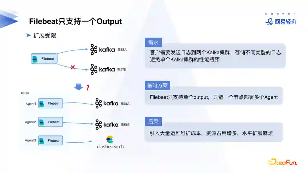 Filebeat只支持单个Output,当用户需要把日志发送到多个Kafka集群时,只能在同一个节点上部署多个Filebeat。导致运维成本高、计算资源消耗大、水平扩展困难。
