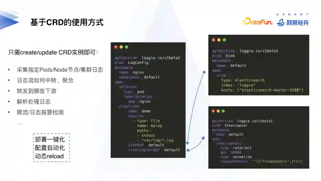 通过CRD的方式打通日志处理链路,用户可以通过配置CRD定义日志中转、聚合和发送的方案,可以配置日志的解析、限流、报警规则,在进行私有化部署和将日志服务平台化时大大降低了配置管理的复杂度,一旦有配置变更,k8s可以快速地把配置同步到日志采集服务中。