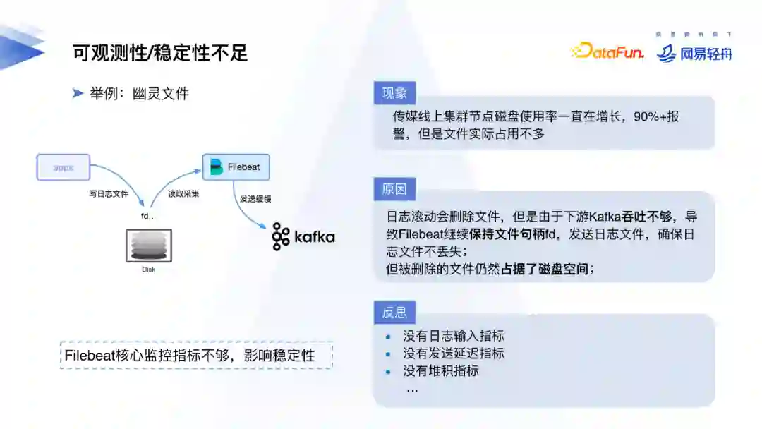 我们以一个线上问题为例。线上某集群经常遇到磁盘使用量短时间内暴增到90%以上并触发报警的情况。实际登录节点排查问题后,发现报警的原因在于下游Kafka吞吐量不够,一些日志文件没有完全采集完毕,Filebeat进程默认保留文件句柄直到文件采集完毕,由于文件句柄没有释放,底层的文件无法被真正删除。但在这种情况下,Filebeat缺乏输入延迟、发送延迟和堆积情况等指标,影响稳定性。