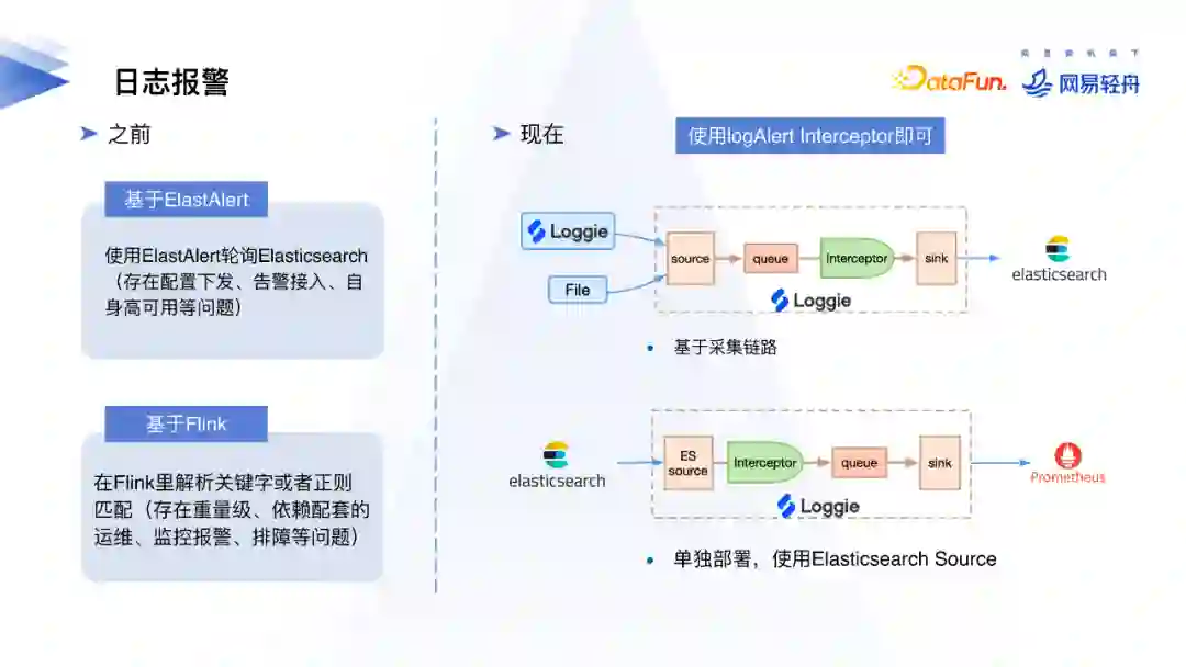 在采用Loggie后,我们可以使用logAlert Interceptor,在日志采集过程中就可以通过关键字匹配识别info或error进行报警。也可以通过单独部署Elasticsearch Source的Loggie Aggregator对Elasticsearch进行轮询,把信息发送到Prometheus进行报警。新版日志报警架构更轻量,维护起来也更简单。