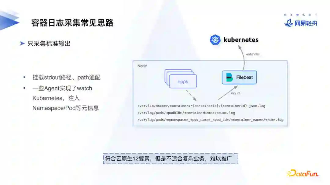 日志打印到标准输出的操作虽然符合云原生十二要素,但是很多业务还是习惯输出到日志文件中,而且只采集标准输出日志难以满足一些复杂业务的需求。常规的采集标准输出日志的方式是挂载/var/lib/docker,/var/log/pods下的目录。同时需要注意选型的日志Agent是否支持注入k8s元信息。