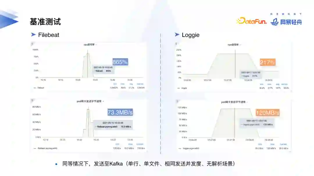 我们利用Filebeat进行了基准测试,在处理单⾏、单⽂件、相同发送并发度、⽆解析的场景下,发送日志⾄Kafka。