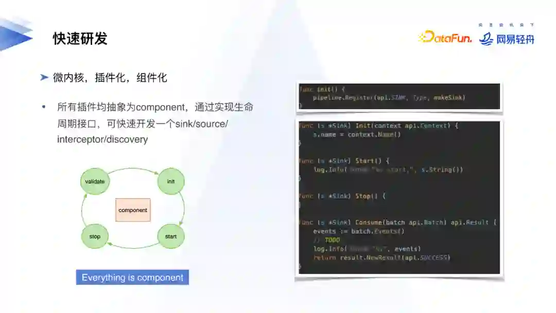 在项目开发方面,我们秉承微内核、插件化、组件化的原则,把所有组件抽象为component。开发者通过实现生命周期接口,可以快速开发数据发送端逻辑、数据源读取逻辑、处理逻辑和服务注册逻辑。这样的设计让需求能更快更灵活地实现,大大了日志采集侧的开发效率。