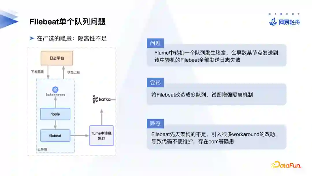 我们尝试把Filebeat改造成多队列的模式增强隔离性,但是由于Filebeat本身的设计架构局限,重构的效果和运行状态都不理想,同时与开源版本的维护和升级存在很大困难。