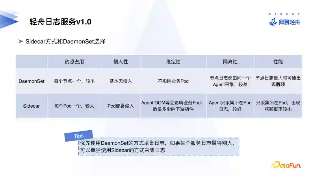 对比DaemonSet和SideCar两种部署方式,DaemonSet在稳定性、侵入性、资源占用方面有优势,但隔离性、性能方面SideCar方式更好。我们实践中会优先使用DaemonSet方式采集日志。如果某个服务日志量较大、吞吐量较高,可以考虑为该服务的Pod配置Sidecar方式采集日志。