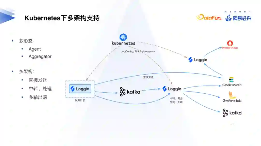 在k8s中我们提供了多种部署方案, 作为Agent部署时,我们提供了DaemonSet或SideCar方式进行部署。作为中转节点部署时可以作为StatefulSet部署。日志采集的架构上更加灵活,可以直接发送到ES,也可以发送给Kafka再交给中转节点,部署方便。
