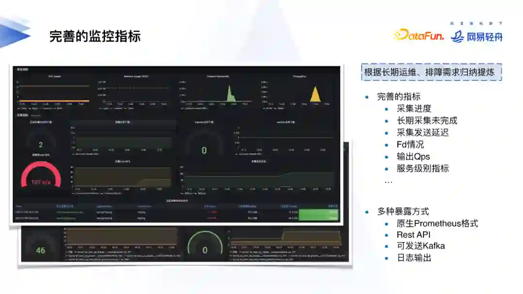 我们为日志采集Agent添加了完善的指标,包括日志采集进度、长期采集未完成、采集发送延迟、FD数量、输出QPS和其他服务级别指标,提供了原生Prometheus格式的接口、RestAPI和指标发送Kafka等方式暴露指标。