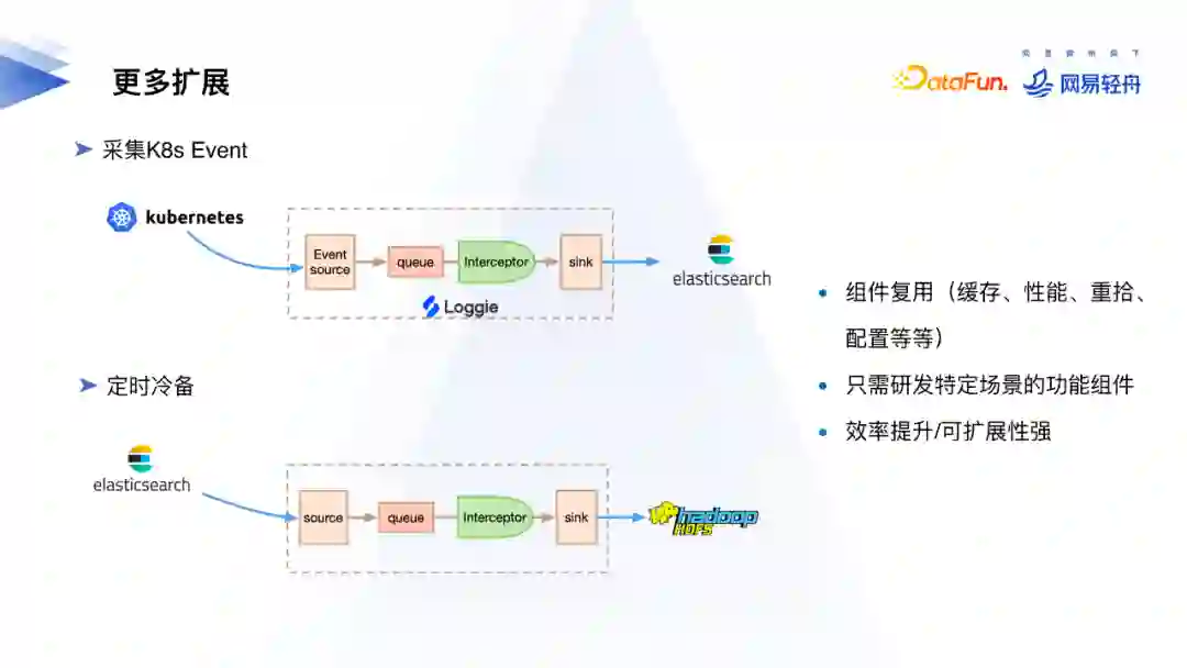 基于灵活高效的Agent数据源设计,我们可以配置kubeEvent source采集K8S Event数据作为监控报警的补充。相比重新实现一个采集K8S Event项目,只需要在Loggie上实现对应的source,其他如队列缓存、解析日志、发送日志的逻辑都可以复用。