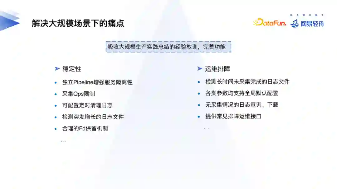 日志采集服务大规模部署的稳定性和排障两方面有很大提升。我们通过独立各个采集任务Pipeline增强服务隔离性,还可以通过Interceptor提供了QPS限制,定时清理日志防止磁盘写满,增加了日志文件突发增长检测和合理的Fd保留机制等。