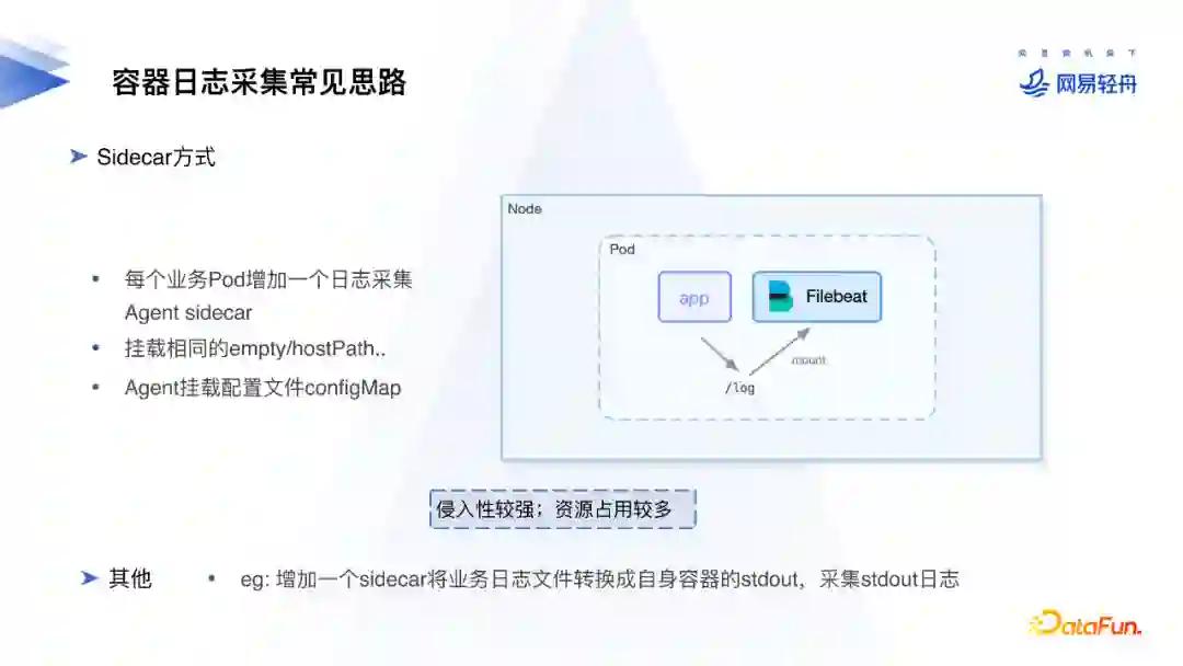 每个业务Pod在部署时都增加一个日志采集的Agent SideCar,可以通过容器平台或k8s webhook的方式把日志采集Agent注入到Pod内。Agent可以通过挂载相同的HostPath或EmptyDir的方式采集到业务容器的日志。