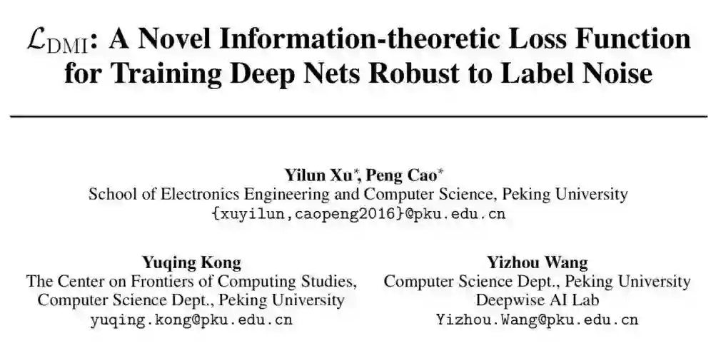 本文是第三十三届神经信息处理系统大会(NeurIPS 2019)入选论文《L_DMI:一种对噪音标注鲁棒的基于信息论的损失函数(L_DMI: A Novel Information-theoretic Loss Function for Training Deep Nets Robust to Label Noise)》的解读。该论文由北京大学前沿计算研究中心助理教授孔雨晴博士和北京大学数字视频编解码技术国家工程实验室教授、前沿计算研究中心副主任王亦洲共同指导,由2016级图灵班本科生许逸伦、曹芃(共同一作)合作完成。