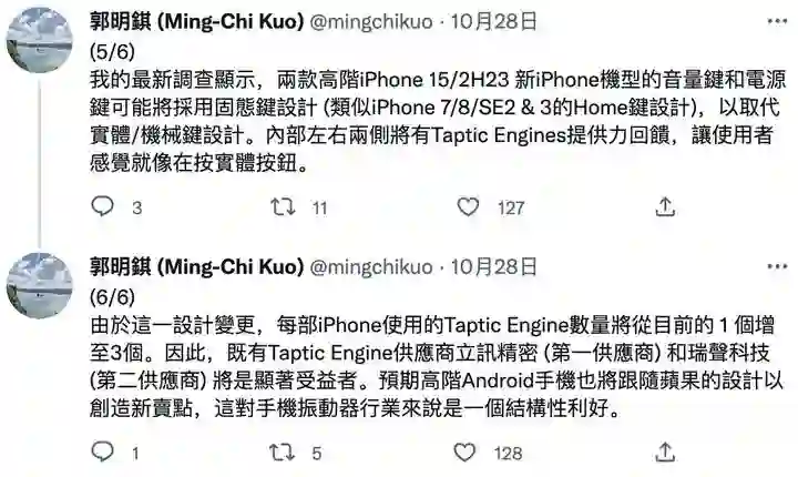 为了提供更有力且更能还原真实的振动反馈,在 iPhone 15 上的 Taptic Engines 线性振动马达之数量也会从 1 个增加到 3 个。