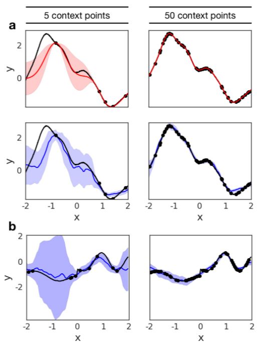图 2:1-D 回归。用 5 个(左列)和 50 个(右列)上下文点(黑点)得到的 1-D 曲线(黑线)回归结果。前两行展示了 GP(红色)和 CNP(蓝色)进行回归的预测平均值和方差,它们只使用单个潜在核函数。最后一行展示了用交换核参数得到的 CNP 预测曲线。