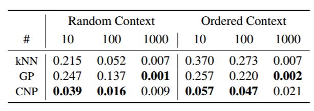表 1:在 Celeb A 数据集上随着上下文点的增加(10、100、1000)在图像补全任务上的所有图像像素的像素级均方误差。这些点或者是随机选择的,或者是按左下到右上的顺序选择的。在提供更少的上下文点的情况下,CNP 超越了 kNN 和 GP。此外,CNP 在点选择顺序排列的情况下也能表现良好,而 GP 和 kNN 在点顺序排列的时候表现变差很多。