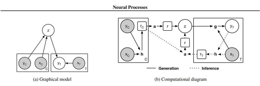 图 1:神经过程模型。(a)神经过程的图模型。x 和 y 对应着 y = f(x) 的数据,C 和 T 分别是上下文点和目标点的数量,而 z 表示全局隐变量。此外,灰色背景表示变量是已经观察到的。(b)为实现神经过程的计算图。圆圈里面的变量对应着这(a)中图模型的变量,方框里面的变量为 NP 的中间表征。而没有框的加粗字母分别表示以下计算模块:h 为编码器、a 为汇集器(aggregator)、g 为解码器。在该实现中,h 和 g 分别对应神经网络,而 a 对应均值函数。最后,实线描述了生成过程,而虚线描述了推断过程。