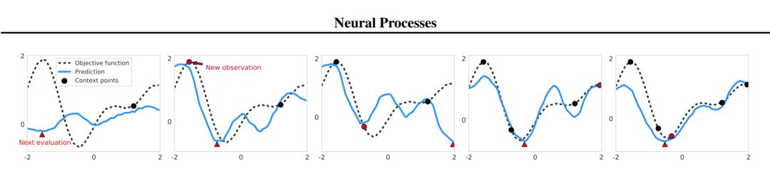 图 5:在 1-D 目标函数利用神经过程的 Thompson sampling。图中展示了五次迭代的优化过程。每个预测函数(蓝色)通过采样一个隐变量进行绘制,以上下文点数的增加为条件(黑色圆)。真实函数由一个黑色点线表示。红色三角形对应采样 NP 曲线的最小值的下一个评估点。下一次迭代中的红色圆对应该评估点及其真值,作为 NP 的下一个上下文点。