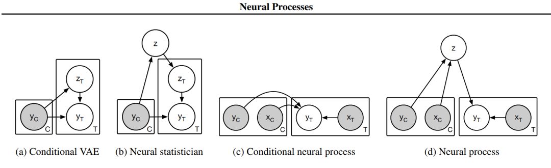 图 2:相关模型(a-c)和神经过程(d)的图模型。灰色阴影表示变量已被观察。C 代表上下文变量,T 代表目标变量(即给定 C 的预测变量)。