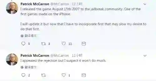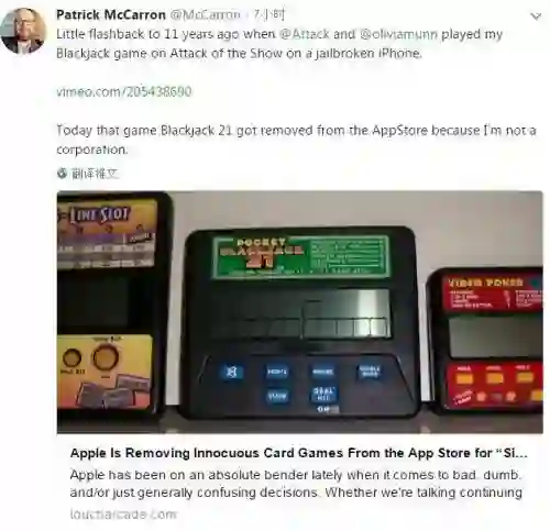 这位开发者称,Blackjack 21(21点)被苹果下架了,就因为它涉嫌赌博还有我不是一家公司。在推文下面,他表示自己2007年8月15日首次发布这款手游,是iPhone首批游戏之一。虽然他已经对苹果的下架处理提出反对,但感觉并没有多大用处。