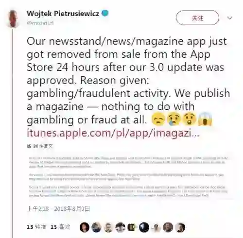 这位开发者称,我们的报亭/新闻/杂志应用程序刚进行3.0更新24个小时,之后就从应用商店下架了。苹果给的理由是:赌博/欺诈活动。我们是出版杂志的——与赌博或欺诈毫无关系。随后在跟帖回复中,这名开发者称该应用已经重新上架。